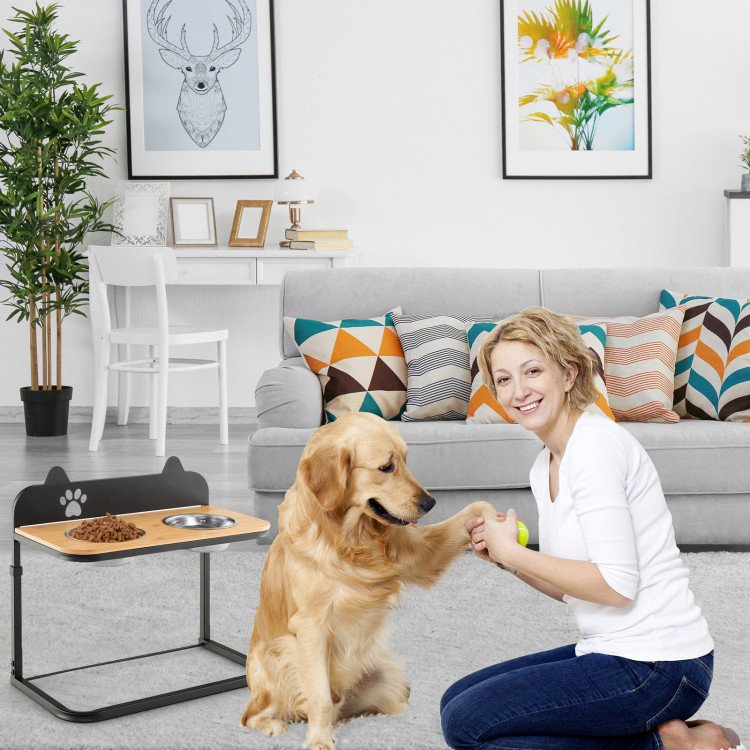 3.Stable and Durable Material: Made of sturdy metal, the dog bowl feeder is not easy to be damaged by pets and the L-shaped frame ensures excellent stability. The special bamboo board tabletop has a waterproof spray, which is more durable and sturdy, while bringing a touch of nature to your home.
