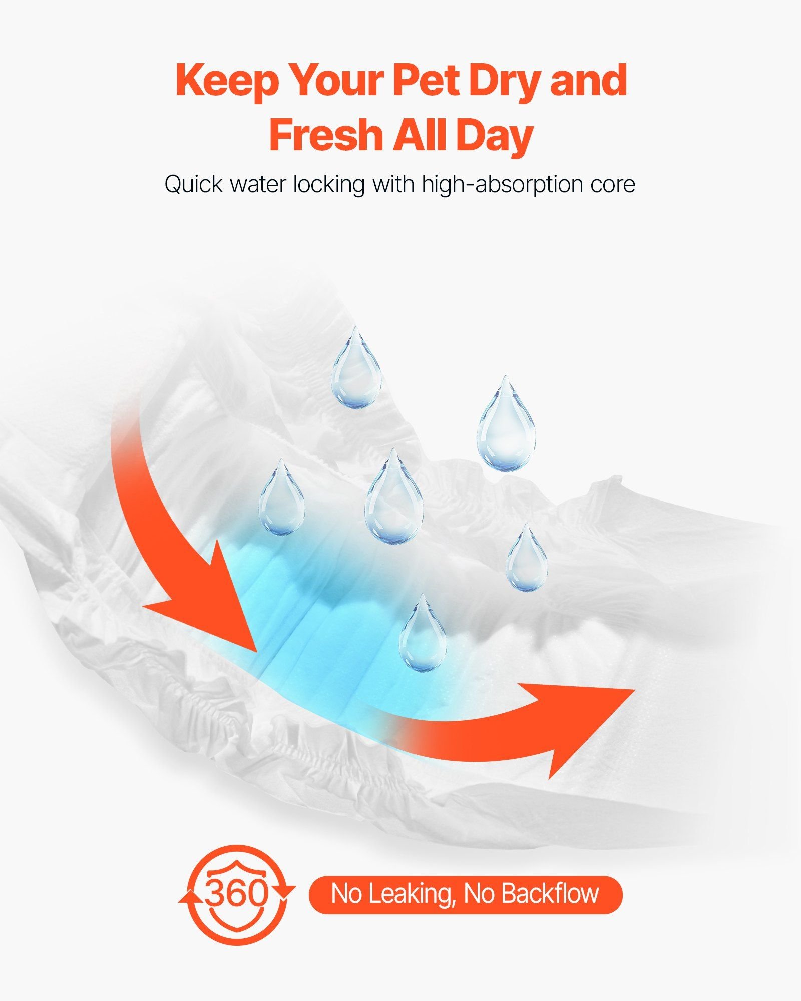 1.Super Absorbent: VEVOR M-sized disposable male dog diapers feature a super absorbent core that quickly locks in liquid, offering 360° leak-proof protection with no backflow. Perfect for dogs in heat cycles, pet training, incontinence, post-surgery recovery, and travel. Suitable Waist Size: 18-25 inches / 45.72 - 63.5 cm